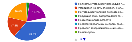 Сама процедура возврата также вызывает недовольство у покупателей. Около 20,8% считают ее неудобной или сложной, а около 17,5% – сталкиваются с длительным ожиданием возврата денег.